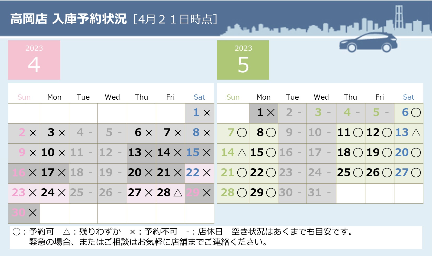 最後に4月29日より当店ゴールデンウィークのお休みを頂いておりますので連休明けの工場の空き状況のお知らせです![]()