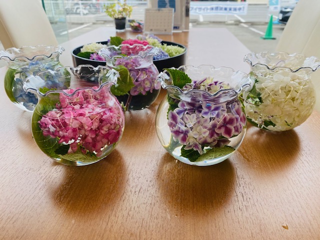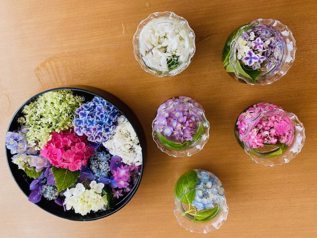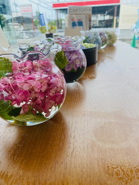 私も最近知ったのですが、花手水などは神社やお寺などで有名だと思いますが、こちらのアジサイガラスボールは
