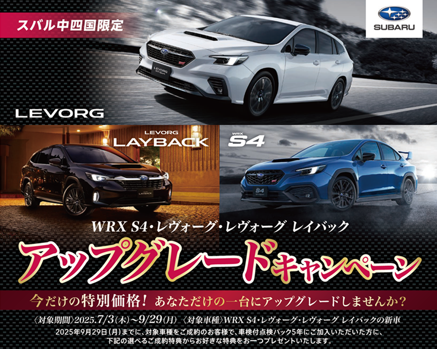 WRX S4・レヴォーグ・レイバックご検討いただいている方にはアップグレードキャンペーンも実施中です!