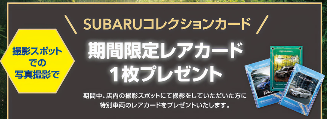イベント期間は特別なアクセサリーを装備した車両のCGイメージ画像の展示や、この期間だけの「SUBARUコレクションカード」を1枚配布いたします。