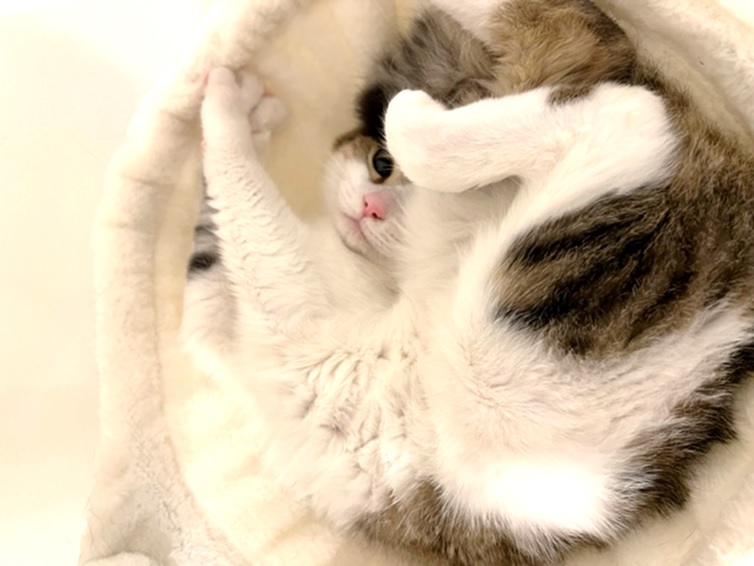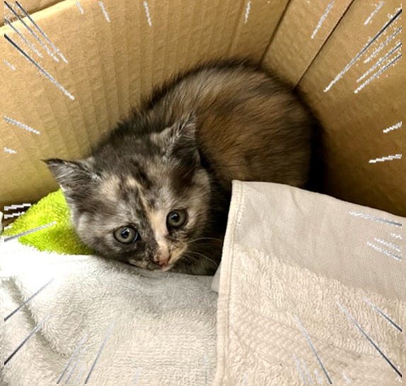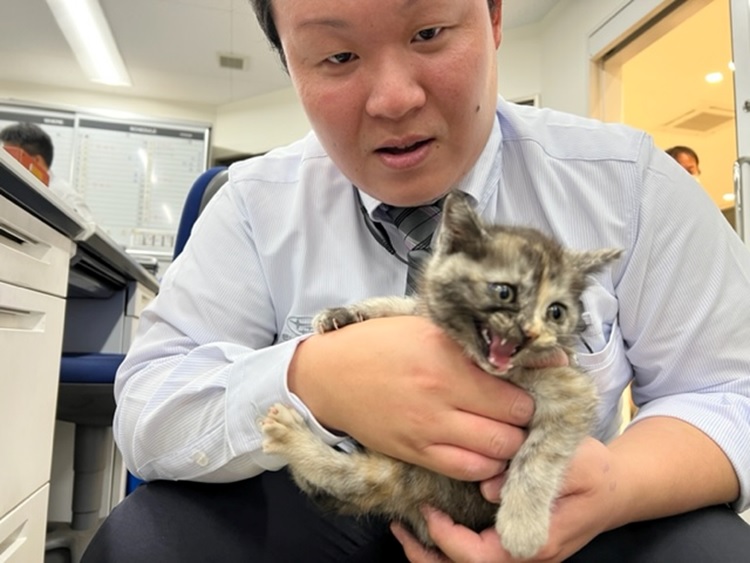 実はこの子にゃんこ、点検でご来店されたお客様のおクルマのボンネットの中に入っていたとのこと。