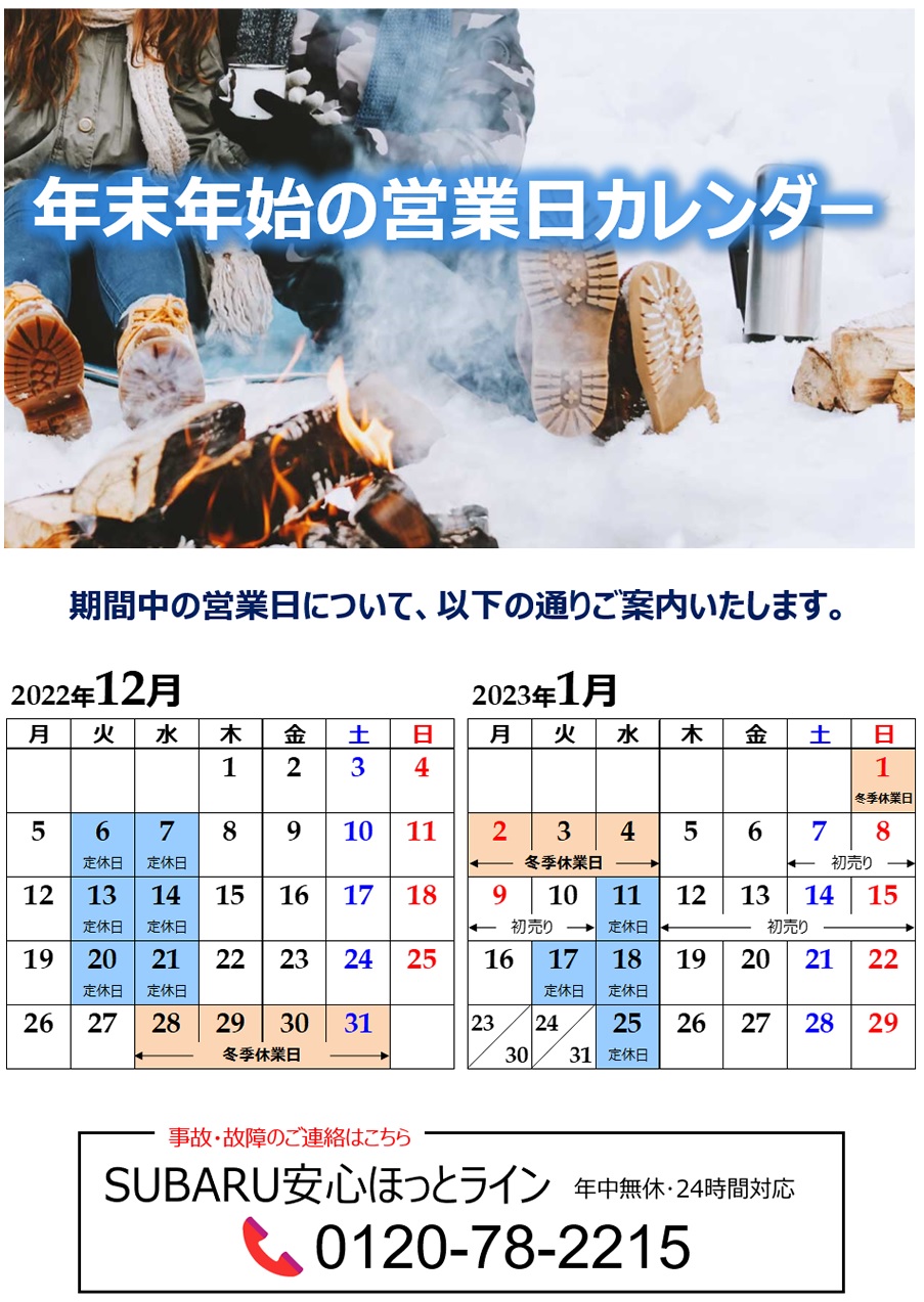 最後に四国スバルでは2022年12月28日(水)-2023年1月4日(水)の期間、冬季休業日とさせていただきます。
