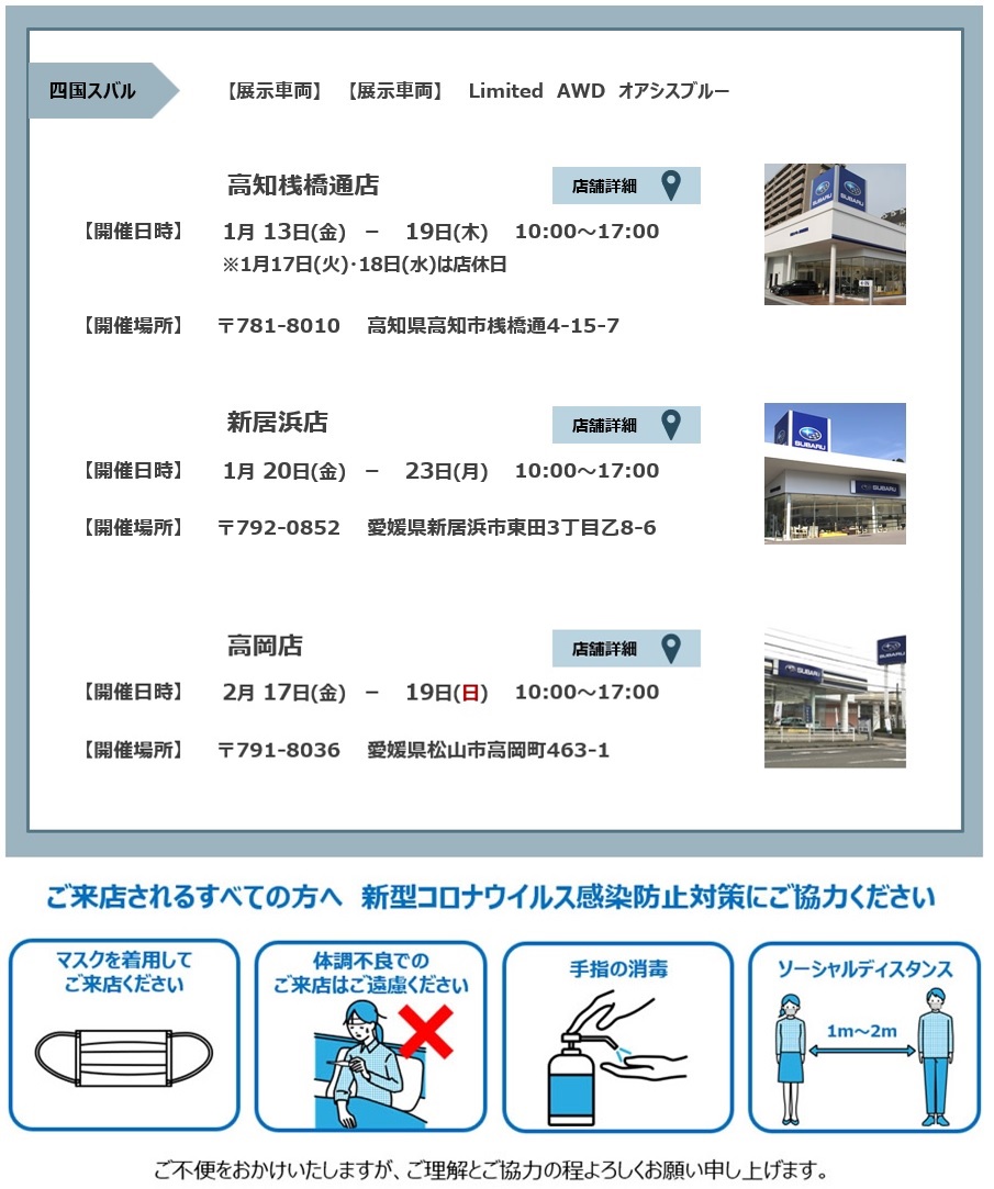 日程は、下記の通りです!新居浜店へ来るのは1月20日(金)-23日(月)の期間です!