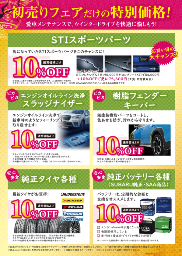 STI用品はもちろん、純正タイヤや純正バッテリー等が通常価格よりお買い得となっています!
