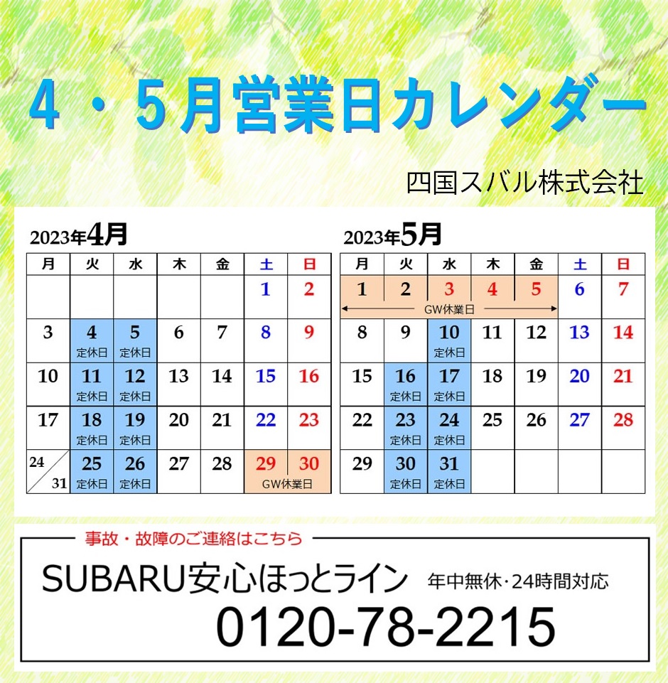 ゴールデンウィークといえば、四国スバルは4月29日(土)-5月5日(金・祝)の期間、長期休業させていただきます。
