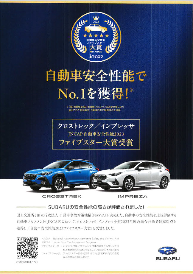 クロストレックとインプレッサが、自動車安全性能で№1を獲得しました!(*‘ω‘ *)パチパチ