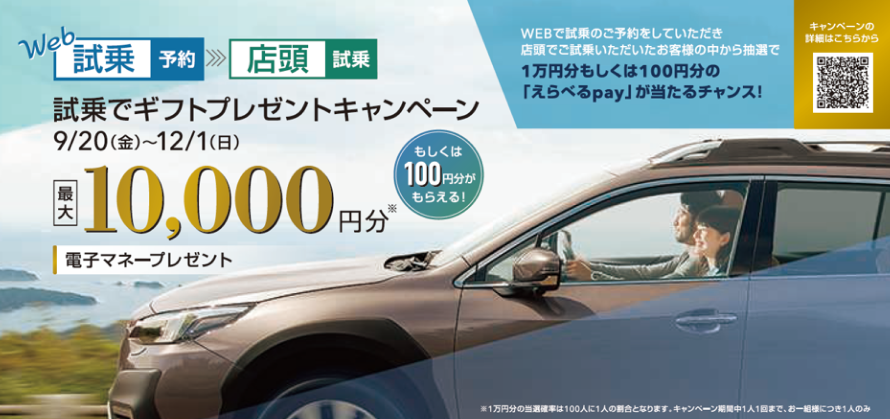 さらにWEBで試乗をご予約された方には電子マネーが最大1万円当たるチャンス!!