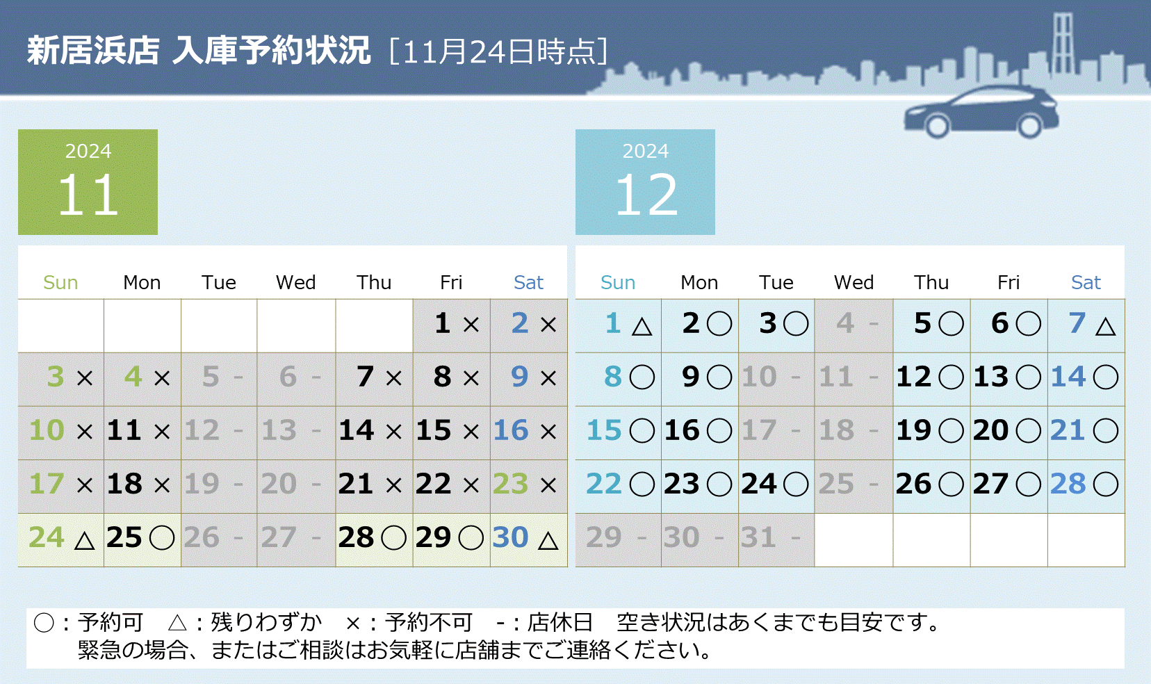 比較的土日も工場は空いていますが、ご希望のお時間にご予約できない日もありますので、点検等のご予約はお早めにお願いします。