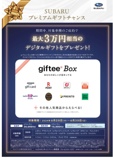 今週も引き続き、6月30日(日)までのSUBARUプレミアムギフトキャンペーン