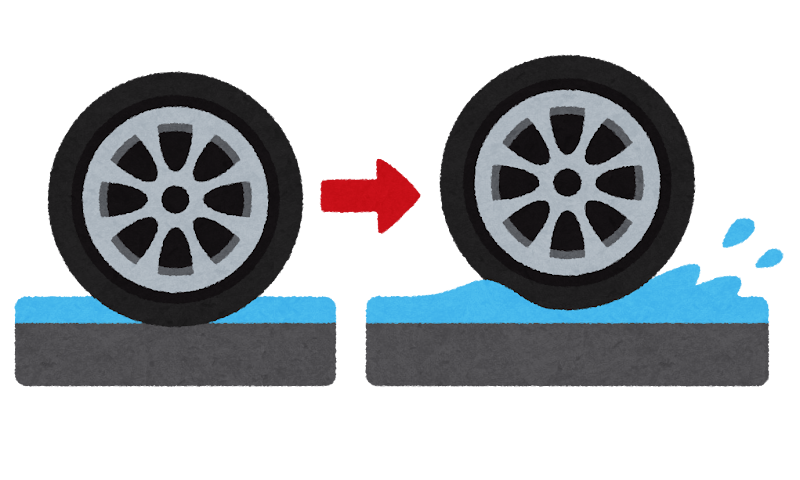 走行してタイヤの溝が浅くなると、水を排水する能力が落ちてきて水に浮きやすくなり、濡れた路面で滑りやすくなったり、ブレーキを掛けた時の停止するまでの距離が長くなってしまったりします。
