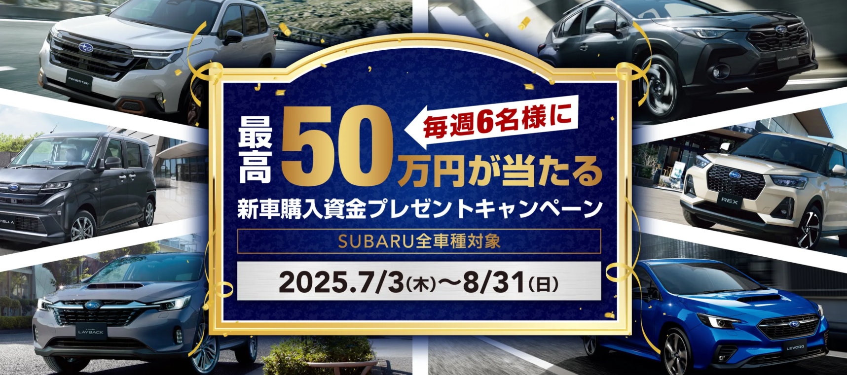 最後にSUBARUでは最高50万円が当たる!新車購入資金プレゼントキャンペーンを