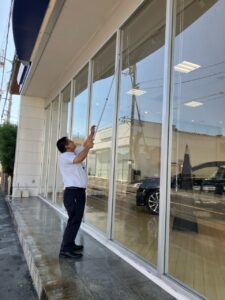 当店舗では、先日ご紹介した高橋と店長によって道路側のガラス掃除をおこないました。
