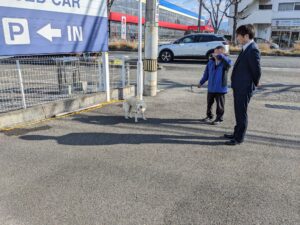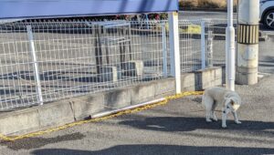 開店準備をしていると、車の陰に1匹のワンちゃん。