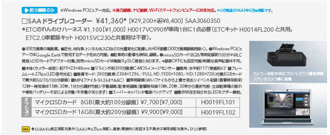 アイサイトの兼ね合いもあり、SAAより販売している汎用ドラレコでもありますが、それでも41,000円ほどします。お高い・・・。