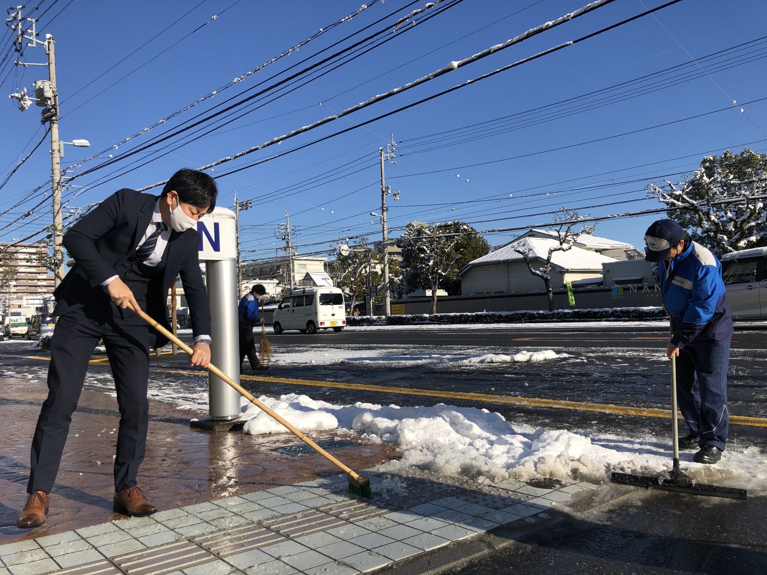朝早くからメカニック総出で駐車場の除雪作業をしてくれています。高知だからできるホース雪かき。豪雪地帯で水で雪や氷を溶かすのは悪手だとされていますが、棒擦りと水やりのホースでマンパワー全開で頑張ります。