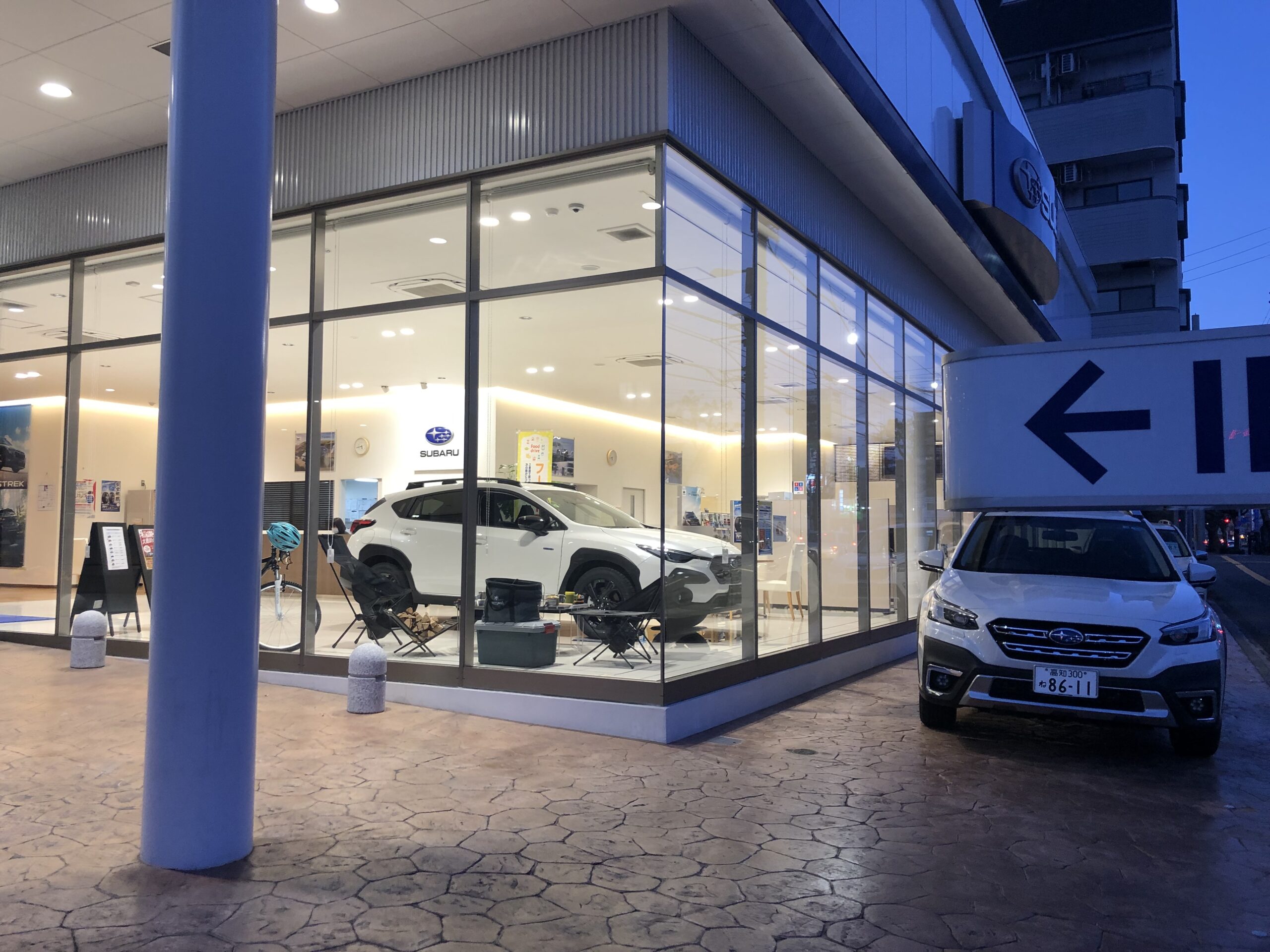 外から撮影するとこんな感じです。キャンプ道具と良い雰囲気に仕上がっています。1ヵ月くらいはこのままいくのではないかと思います。展示車があると一気にディーラー感が高まります。ご興味をお持ちの方は是非、ご来店ください。