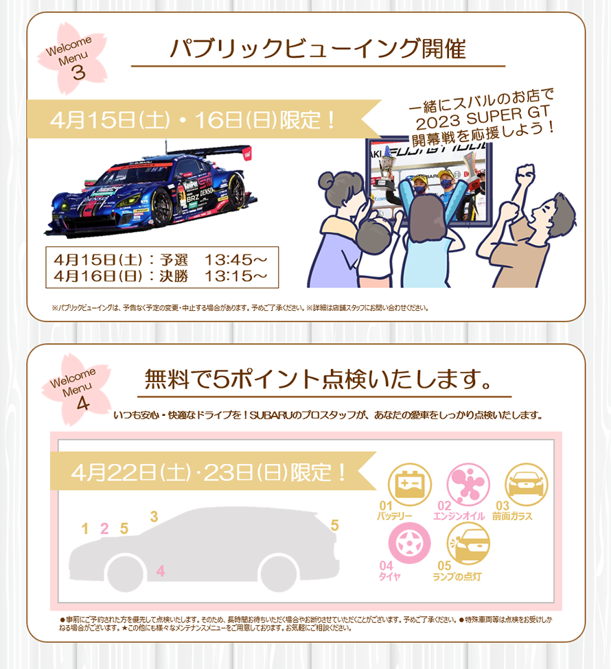 2023 SUPER GTのパブリックビューイングが開催されたり、無料5ポイント点検が受けられたり・・・