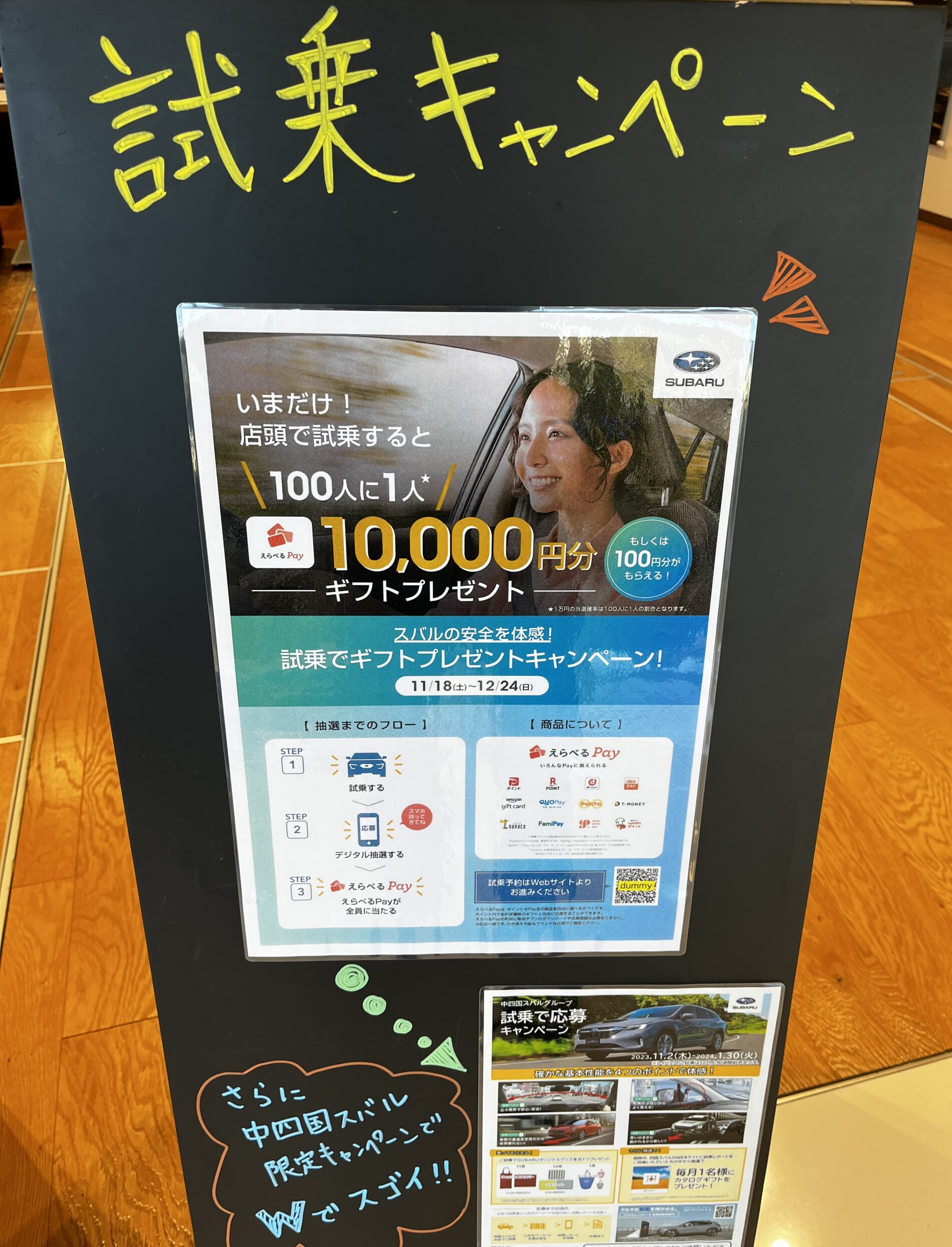 ちなみに確率は100人に1人1万円が当たるそう。そして、中四国スバルで開催しているキャンペーンも参加して頂けるのでとてもアツい試乗キャンペーンになってきました。