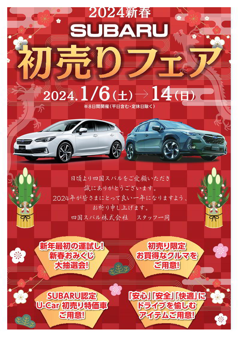 2023年、最後のブログです。早いもので本年も残すところわずかとなりました。四国スバル高知桟橋通店をお引き立て頂き、ありがとうございました。来年も体調管理に気を付け、いっそう皆様のお役に立てるよう尽力して参りますのでどうぞよろしくお願いいたします。