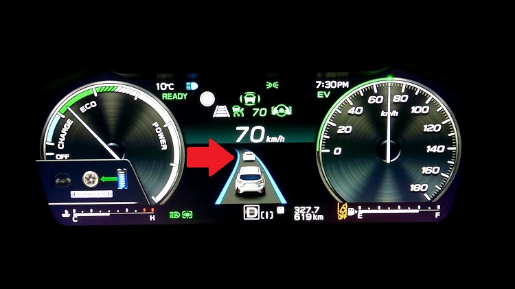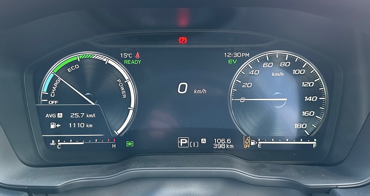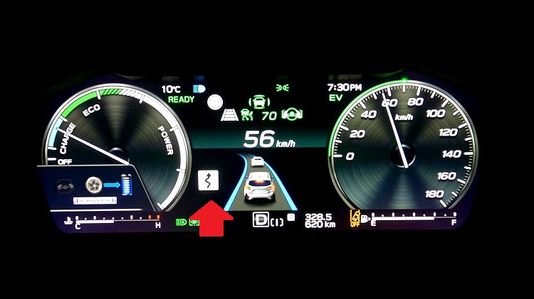 バッテリーの充電が4目盛ほどなされていましたのでセレクトレバーをD(ドライブ)に入れてもまだエンジンは始動せず、ブレーキペダルを離してもなおかすかに聞こえるのはモーターの作動音や車両接近通報装置のみです。