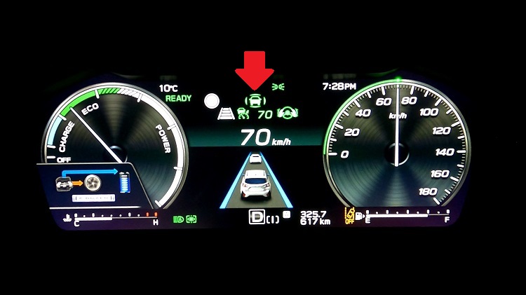 高速道路に乗り込み2車線以上でアイサイトXスイッチをポチっと押せば、メーターにもアイサイトXがONになったと緑色の表示が灯ります。
