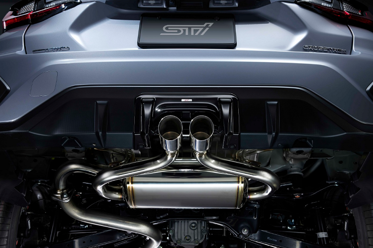 テールパイプ部Φ70デュアルセンター出しレイアウト、STIロゴ刻印入り