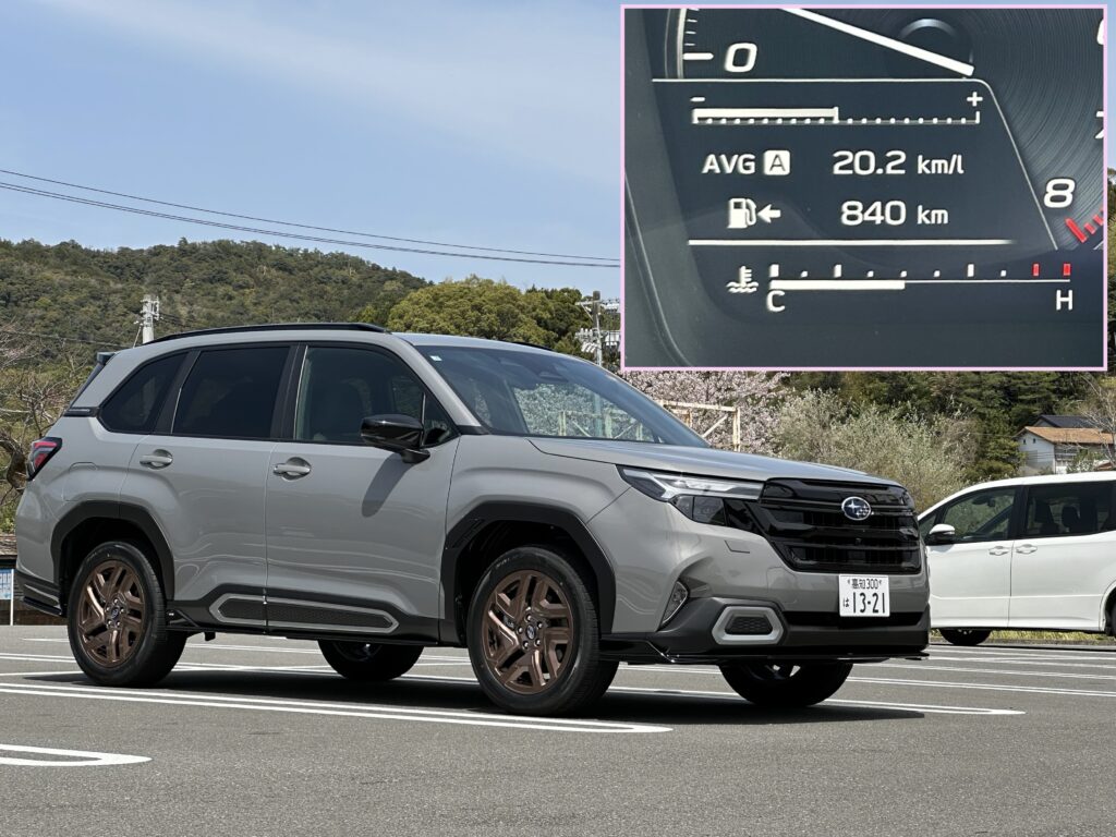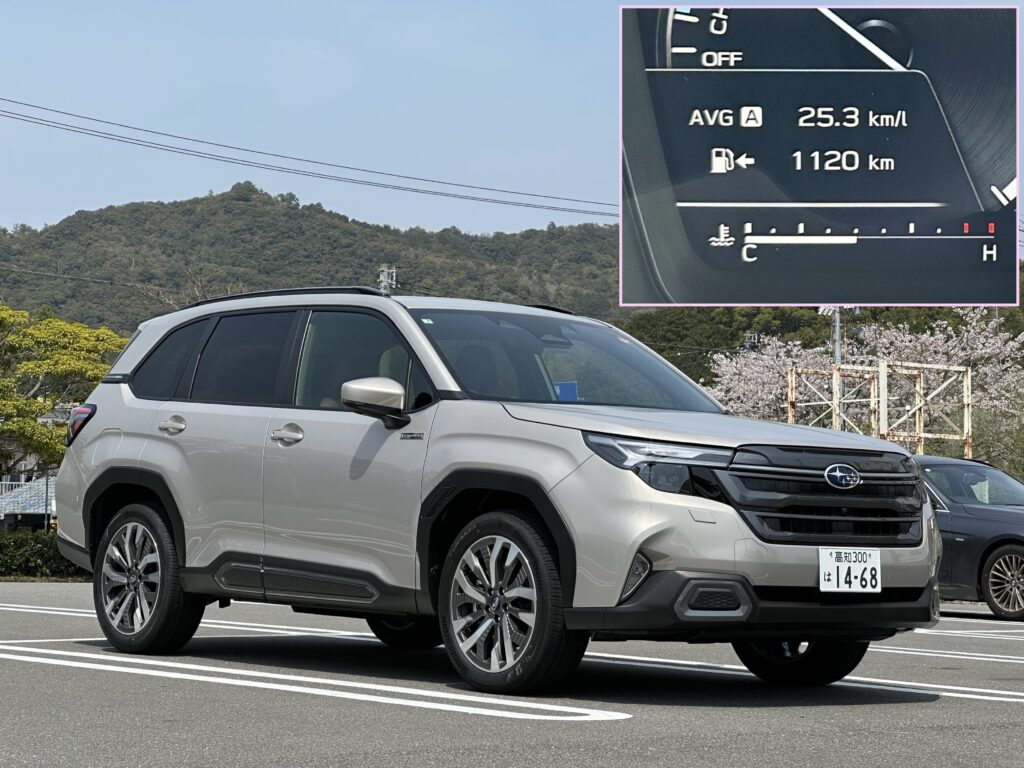 前回のクロストレックS:HEVがほぼ同じ条件下で25.7km/Lでしたので、フォレスターとの車重差(約100kg)を考えればかなり優秀ですね。
