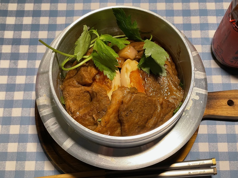 夕飯は羽釜でご飯を炊き、その上にスキレットで焼いた牛ロースとコンビニで買った半熟卵を載っけて最後に自宅の庭から引っこ抜いて来た三つ葉を散らしたら完成!