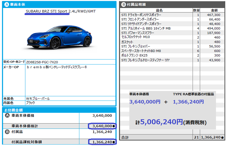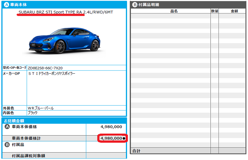 お次はこちらのTYPE RAの見積書をご覧ください。