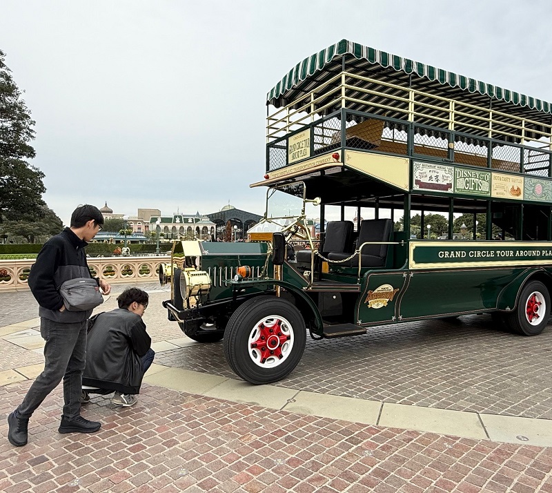 整備士の二人はシンデレラ城には目もくれず二階建てバスに夢中な様子。自動車産業に携わる者の鑑ですね。