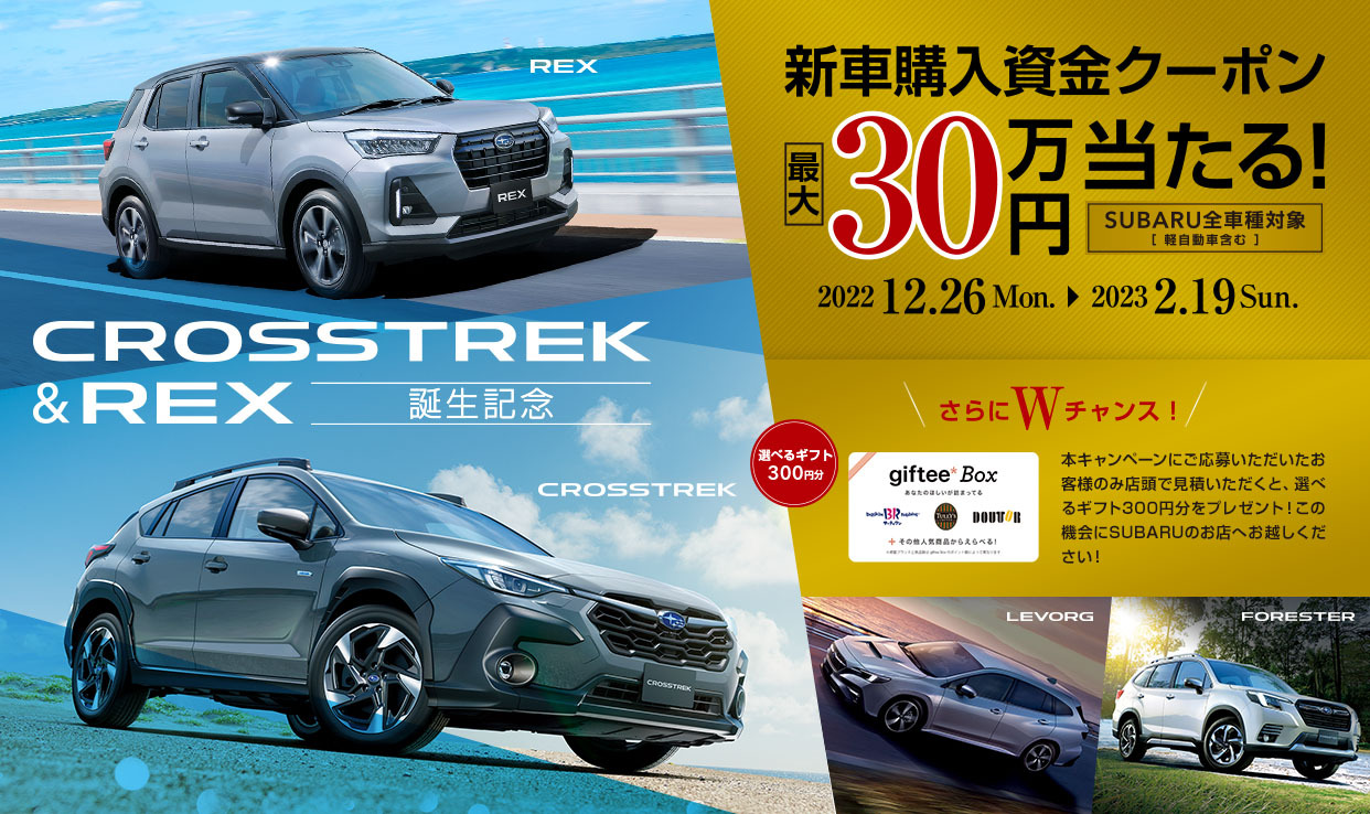 CROSSTREK&REXの誕生を記念して、抽選・成約で合計456名様に最大で30万円の新車購入クーポンが当たるキャンペーンを実施しております。