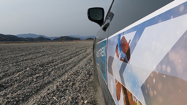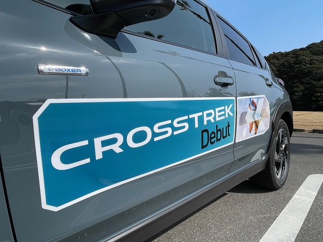 今回、クロストレックのデビューを大々的に告知すべく、車両側面にステッカーが貼られています。
