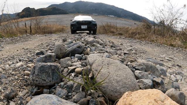10cm以上の石ころがゴロゴロとしていますのでレヴォーグでの走行は躊躇してしまいますが、クロストレックであれば20cmの最低地上高により余裕で走破できます。