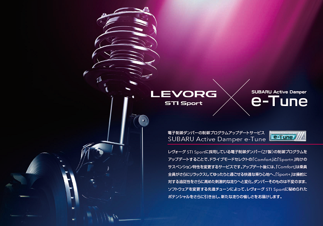 レヴォーグ STI Sportに採用している電子制御ダンパー(ZF製)の制御プログラムをアップデートすることで、ドライブモードセレクトの「Comfort」と「Sport+」向けのサスペンション特性を変更するサービスです。アップデート後には、「Comfort」は乗員全員がさらにリラックスしてゆったりと過ごせる快適な乗り心地へ、「Sport+」は操舵に対する追従性をさらに高めた刺激的な走りへと変化。ダンパーそのものは不変のまま、ソフトウェアを変更する先進チューンによって、レヴォーグ STI Sportに秘められたポテンシャルをさらに引き出し、新たな走りの愉しさをお届けします。