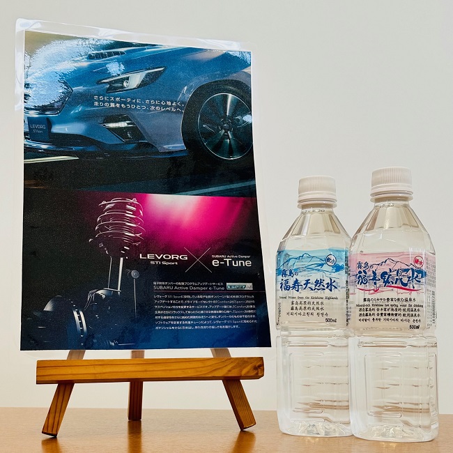 また、LEVORG DAYの期間中に高知東店でe-Tuneをご体感(※)いただいたお客さまには、霧島の福寿天然水と福寿鉱泉水の飲み比べセット(各500mlペットボトル)をプレゼントいたします!