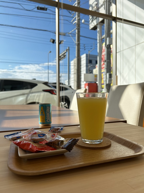 明日もバイクに乗って風を感じてくるそうです。オランジーナを飲みながら笑