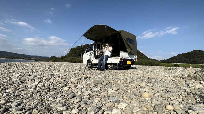 先日のこと。愛車のサンバーで河原にバストロンボーンの練習に行ってきました!
