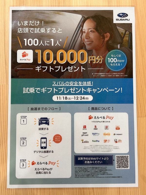 抽選で最高10,000円分の「えらべるギフトクーポン」が当たる「試乗でギフトプレゼントキャンペーン」を開催中![]()