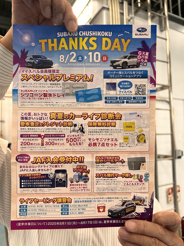 さーあお盆休みの時期が近づいてきました、、今年のスバルは7連休になります。