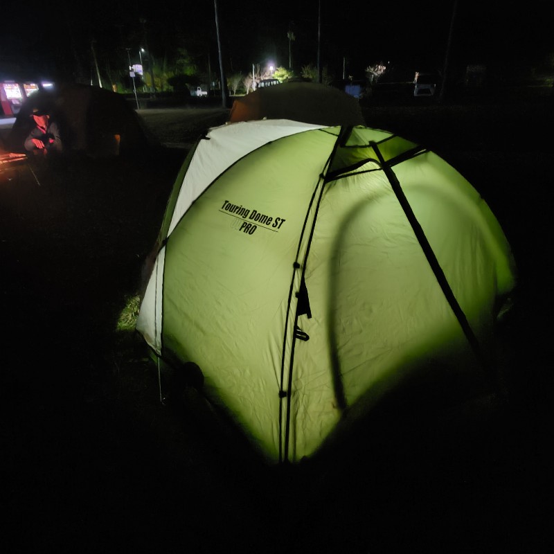 筆者のテント設営したのはいつぶりでしょうか、テント内のLEDランタンに照らされて提灯みたいになってるテントは個人的にお気に入り