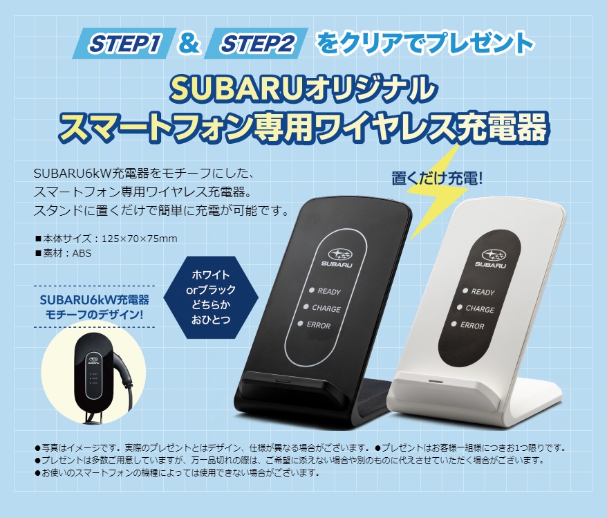 以上のSTEPをクリアした方は、SUBARUリジナルスマートフォン専用ワイヤレス充電器をプレゼント!