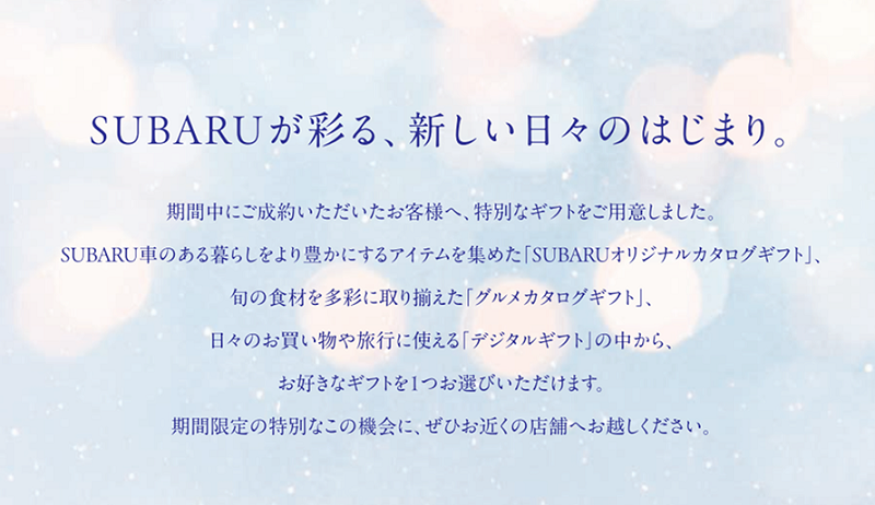 期間中に対象車種のご成約で「SUBARUオリジナルカタログギフト」、「グルメカタログギフト」、「デジタルギフト」の中から、お好きなギフトを1つお選びいただけます。
