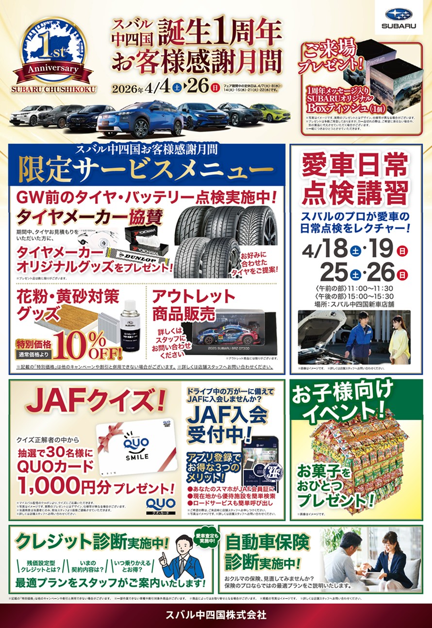 スバル中四国1周年 お客様感謝月間!!2026年03月27日